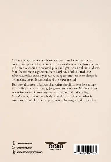A Dictionary of Love is not a book of definitions, but of entries: 22 poems that speak of love in its many forms, devotion and loss, ancestry and home, oneness and survival, play and light. Berna Kahraman draws from the intimate, a grandmother’s laughter, a father’s medicine cabinet, a child’s curiosity about outer space, and sets them alongside the mythic, the philosophical, and the experimental.