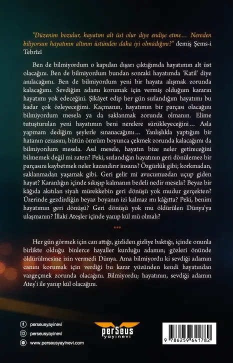 Ben de bilmiyordum o kapıdan dışarı çıktığımda hayatımın alt üst olacağını. Ben de bilmiyordum bundan sonraki hayatımda 'Katil' diye anılacağımı. Ben de bilmiyordum yeni bir hayata alışmak zorunda kalacağımı. Sevdiğim adamı korumak için vermiş olduğum kararın hayatımı yok edeceğini. Şikâyet edip her gün sızlandığım hayatımı bu kadar çok özleyeceğimi. Kaçmanın, hayatımın bir parçası olacağını bilmiyordum mesela ya da saklanmak zorunda olmanın. Elime tutuşturulan yeni hayatımın beni nerelere sürükleyeceğini… Asla yapmam dediğim şeylerle sınanacağımı… Yanlışlıkla yaptığım bir hatanın cezasını, bütün ömrüm boyunca çekmek zorunda kalacağımı da bilmiyordum mesela. Asıl mesele, hayatın bize neler getireceğini bilmemek değil mi zaten? Peki, sızlandığın hayatının geri dönülemez bir parçasını kaybetmek neler kazandırır insana? Özgürlük gibi; korkmadan, saklanmadan yaşamak gibi. Geri gelir mi avucumuzdan uçup giden hayat? Karanlığın içinde sıkışıp kalmanın bedeli nedir mesela? Beyaz bir kâğıda akıtılan siyah mürekkebin geri dönüşü yok mudur gerçekten? Üzerinde gezdirdiğin beyaz boyanın izi kalmaz mı kâğıtta? Peki, benim hayatımın geri dönüşü? Geri dönüşü yok mu öldürülen Dünya'ya ulaşmanın? İllaki Ateşler içinde yanıp kül mü olmalı?
