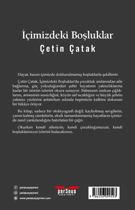 Çetin Çatak, İçimizdeki Boşluklar’da çocukluk anılarından aile bağlarına, göç yolculuğundan şehir hayatının yalnızlıklarına kadar bir ömrün izlerini okura sunuyor. Babasının suskun çığlıklarını, annesinin sessizliğini, köyün saf sıcaklığını ve büyük şehrin yabancı yüzlerini anlatırken aslında hepimizin kalbine dokunan bir hikâye örüyor.