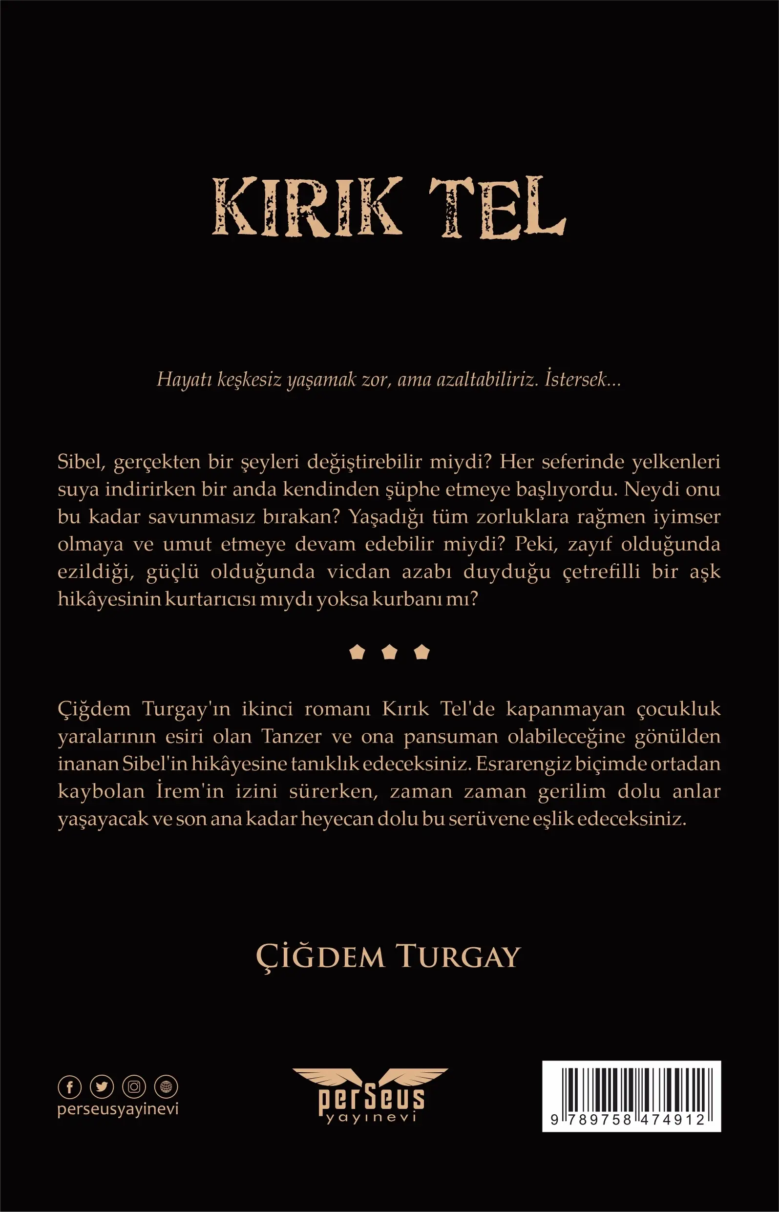 Çiğdem Turgay'ın ikinci romanı Kırık Tel'de kapanmayan çocukluk yaralarının esiri olan Tanzer ve ona pansuman olabileceğine gönülden inanan Sibel'in hikâyesine tanıklık edeceksiniz. Esrarengiz biçimde ortadan kaybolan İrem'in izini sürerken, zaman zaman gerilim dolu anlar yaşayacak ve son ana kadar heyecan dolu bu serüvene eşlik edeceksiniz.