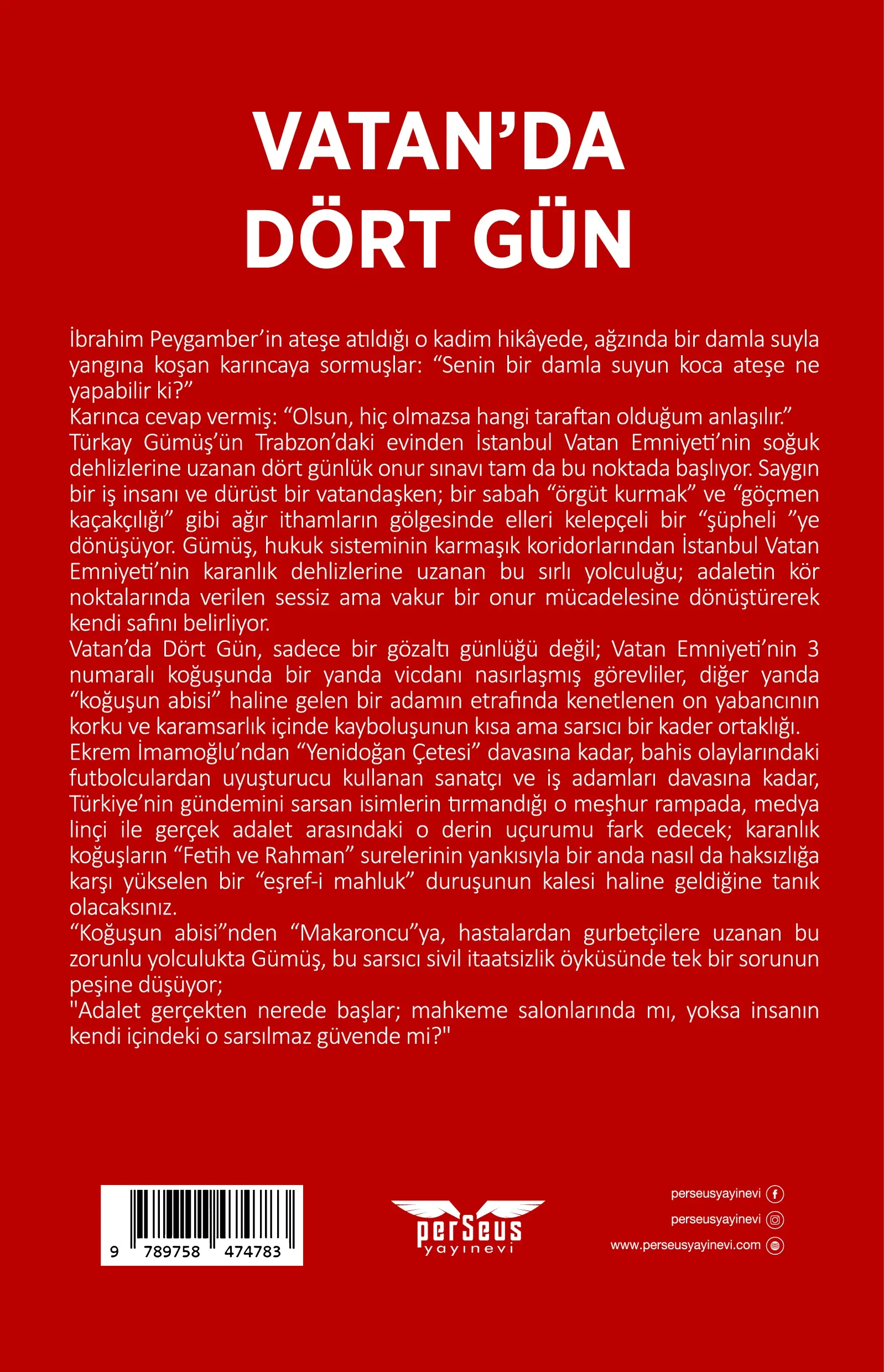 Türkay Gümüş’ün Trabzon’daki evinden İstanbul Vatan Emniyeti’nin soğuk dehlizlerine uzanan dört günlük onur sınavı tam da bu noktada başlıyor. Saygın bir iş insanı ve dürüst bir vatandaşken; bir sabah “örgüt kurmak” ve “göçmen kaçakçılığı” gibi ağır ithamların gölgesinde elleri kelepçeli bir “şüpheli ”ye dönüşüyor. Gümüş, hukuk sisteminin karmaşık koridorlarından İstanbul Vatan Emniyeti’nin karanlık dehlizlerine uzanan bu sırlı yolculuğu; adaletin kör noktalarında verilen sessiz ama vakur bir onur mücadelesine dönüştürerek kendi safını belirliyor.
